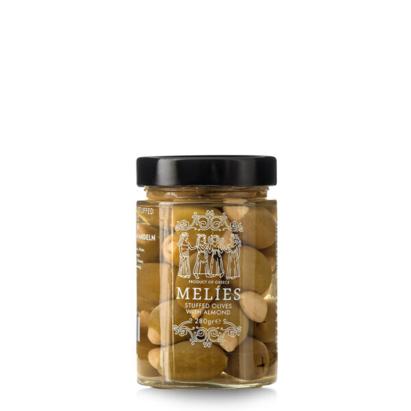 Authentic and delicious pitted green olives stuffed with a whole blanched almond.